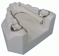 This appliance maintains the position of the maxillary molars without using any other teeth. The plastic button on the palate provides stability.